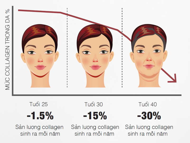 Đây là quá trình không thể tránh khỏi khi tuổi tác gia tăng. Khi da bị mất đi collagen, elastin và độ ẩm vốn có thì khả năng tái tạo tế bào da cũng sẽ giảm đi. Da sẽ bị mất độ căng mịn và đàn hồi. Kèm theo đó da cũng sẽ xuất hiện những dấu hiệu như nếp nhăn, sắc tố da không đều và thiếu sự rạng rỡ.