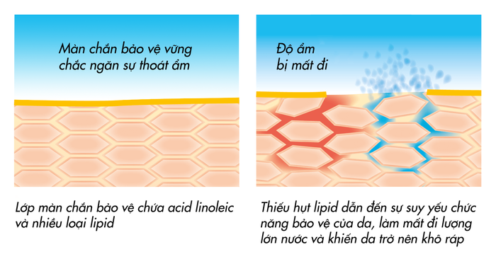 Lớp màng Hydrolipid: Nằm ở lớp ngoài cùng của da, có công dụng bảo vệ và duy trì độ ẩm cho da. Khi lớp màng này không cân bằng và ổn định, độ ẩm bên trong da sẽ bị thất thoát ra ngoài, từ đấy khiến da trở nên thiếu ẩm, khô căng.