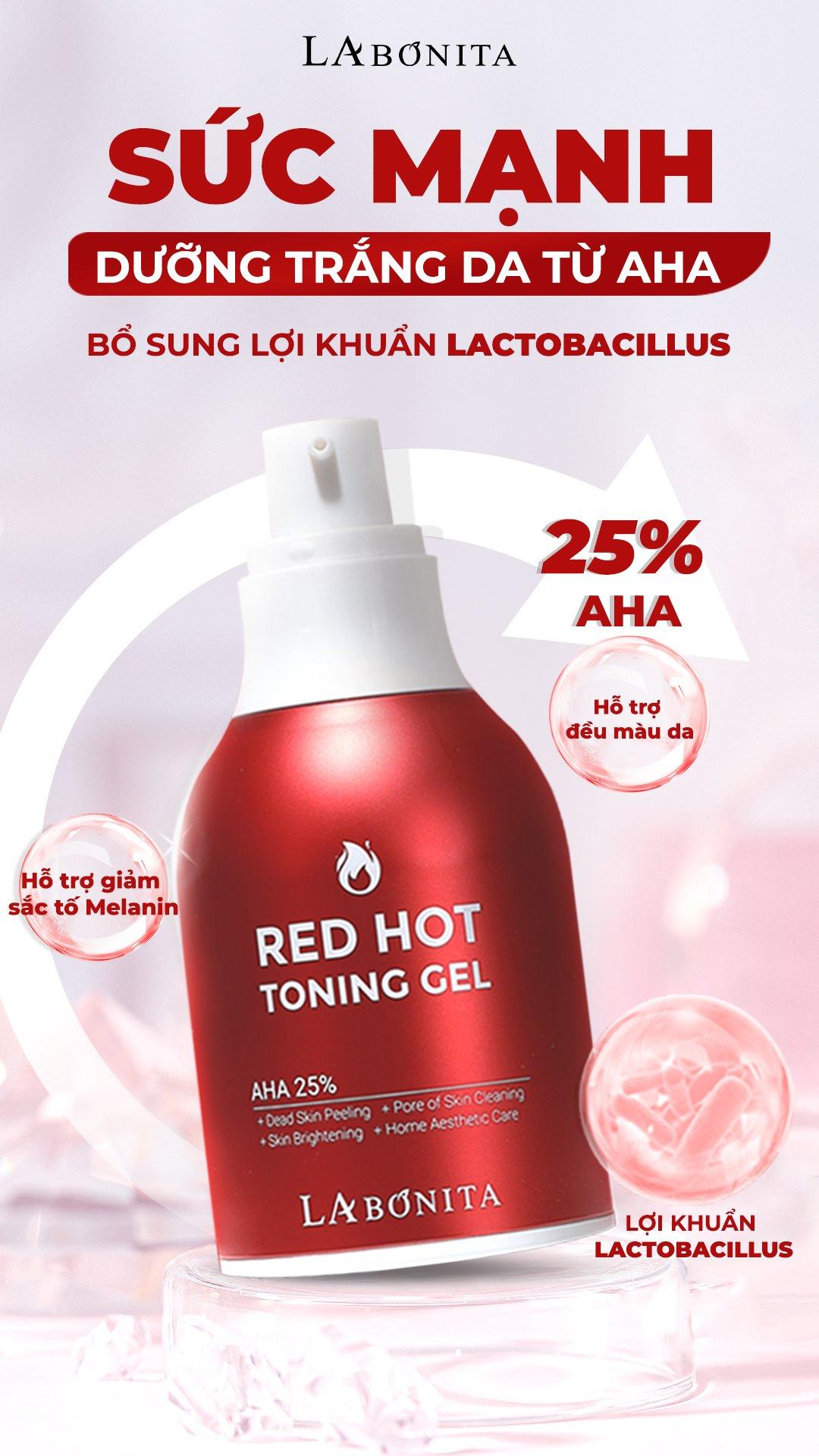 Gel Tẩy Da Chết AHA La Bonita Red Hot Toning Gel 30g có Nồng độ AHA mang lại hiệu quả dưỡng da mạnh mẽ – Nồng độ cao nhưng không gây ra kích ứng. Dùng được cho cả những làn da mẫn cảm dễ kích ứng, mang đến giải pháp hiệu quả cho làn da sạch mụn, mờ thâm.
