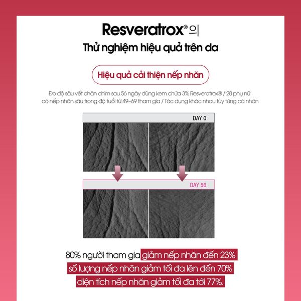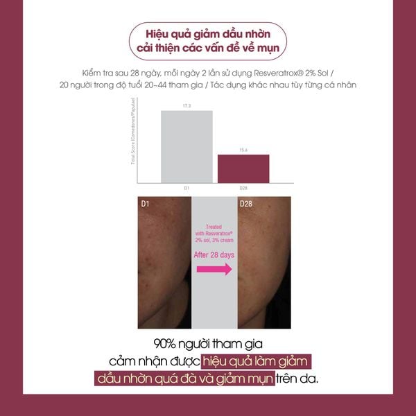 Resveratrox® 2%: Giúp kích thích sản sinh collagen và elastin, giúp da săn chắc, đàn hồi và giảm thiểu nếp nhăn. Bảo vệ da khỏi tác hại của các gốc tự do, nguyên nhân chính gây ra lão hóa da. Đồng thời, giảm thiểu sự hình thành melanin, cải thiện tình trạng da xỉn màu và đều màu da.