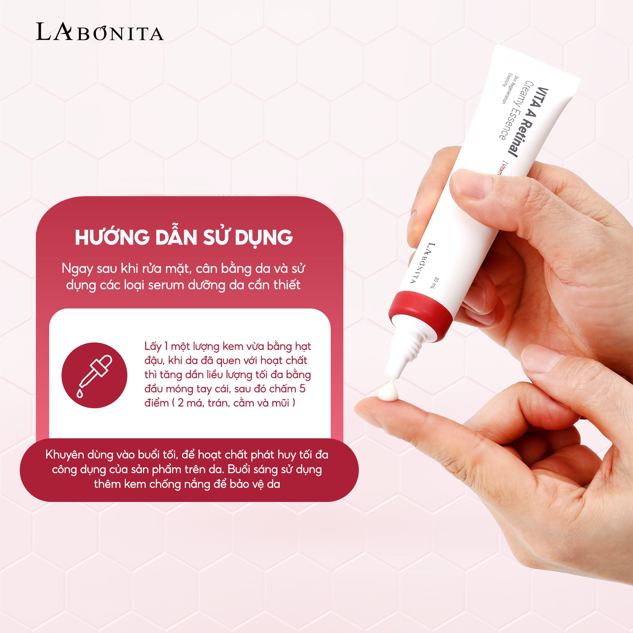 Kem Dưỡng Labonita Vita A Retinal Creamy Essence, với bảng thành phần chủ đạo 1.000ppm Retinal, hay còn được gọi là (Aldehyde Dehydro Retinol), là một dẫn xuất mạnh mẽ của vitamin A, đóng vai trò quan trọng trong việc: