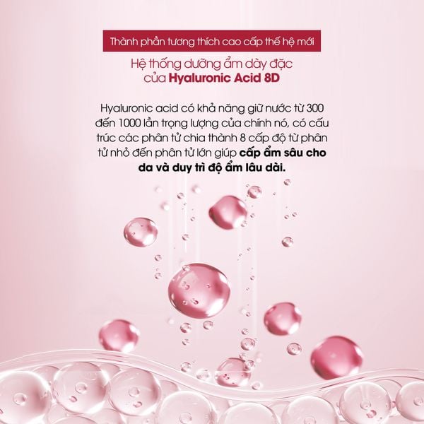 Hyaluronic acid 8D: Với khả năng giữ nước gấp 1000 lần trọng lượng của nó, giúp cung cấp độ ẩm cần thiết cho da, làm cho da mềm mại, mịn màng và căng mọng. Hyaluronic acid 8D giúp kích thích sản sinh collagen và elastin, giúp da săn chắc và đàn hồi hơn.