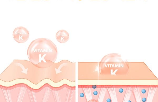 Trong trường hợp da nhiễm Corticoid và Aspirin, Vitamin K đóng vai trò như chất cải thiện tình trạng giãn mao mạch, ửng đỏ và giúp phục hồi da cực kỳ hiệu quả. Với khả năng thúc đẩy sự trao đổi chất của tế bào và thúc đẩy nhanh quá trình làm lành vết thương bằng cách tăng sự co lại và tái biểu mô vết thương, sản phẩm chứa vitamin K hạn chế được các đợt bùng phát mụn do Corticoid gây ra. Làn da mỏng và giãn mao mạch cũng được cải thiện nhờ công dụng làm dày tầng biểu bì, cải thiện quá trình khô hóa cũng như tiết dầu bất thường của da. Bên cạnh đó, đặc tính chống oxy hóa và khả năng chống đông máu của Vitamin K cũng giúp cải thiện tình trạng thâm mắt.