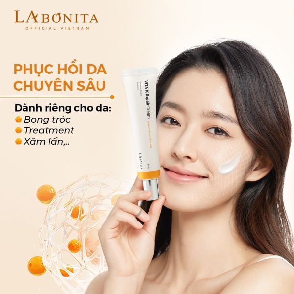 Kem Dưỡng Phục Hồi Da La Bonita Vita K Repair Cream 30ml mang đến khả năng phục hồi da vượt trội, làm lành nhanh các tổn thương trên da do giãn mao mạch, thâm đỏ, bầm tím, sau peel da, sau laser, sau xâm lấn và tiểu phẫu nhờ sức mạnh của Vitamin K.
