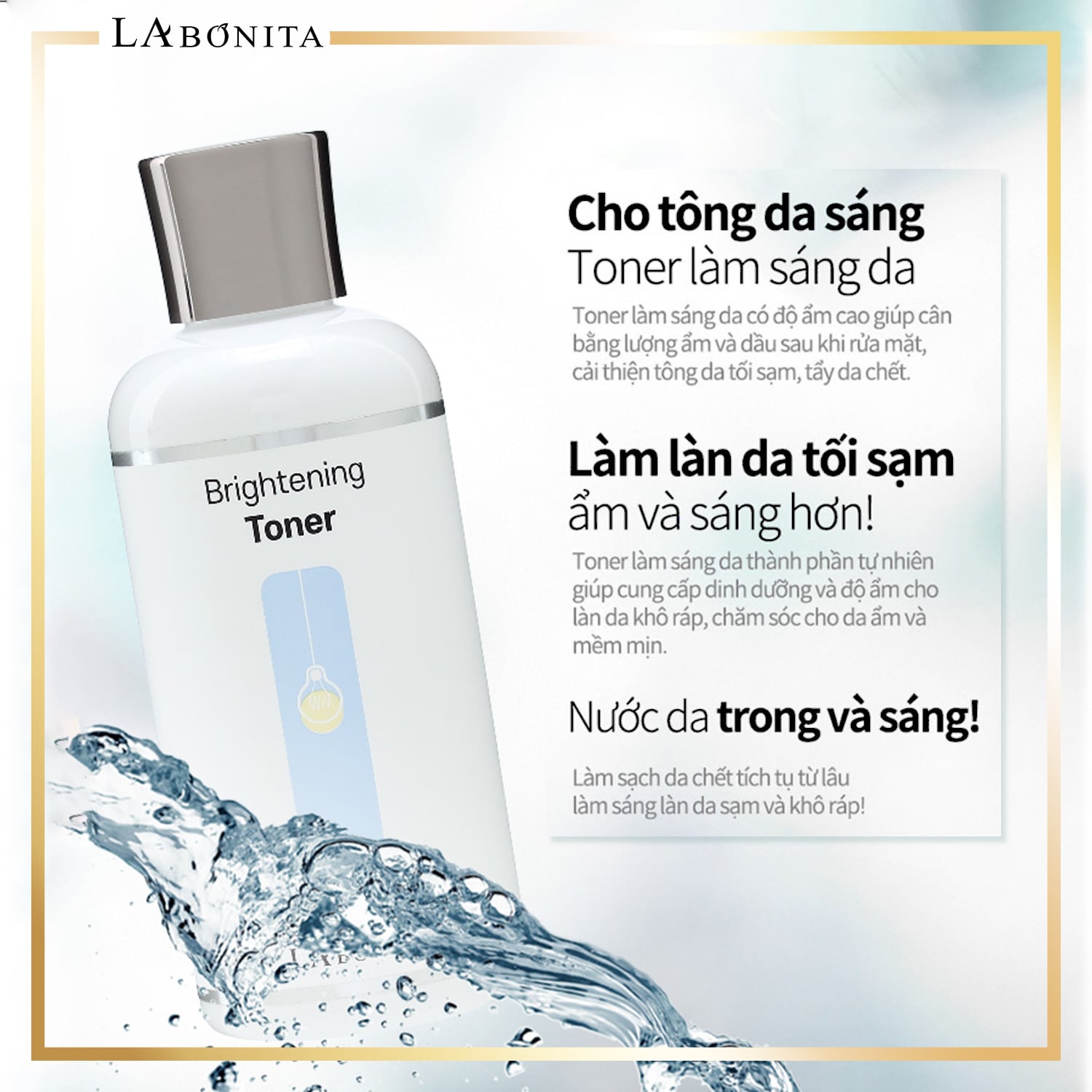La Bonita Brightening Toner chứa 5% Niacinamide và 43% Chiết xuất cam thảo hiệu quả trong dưỡng sáng da, không gây dị ứng cho da.