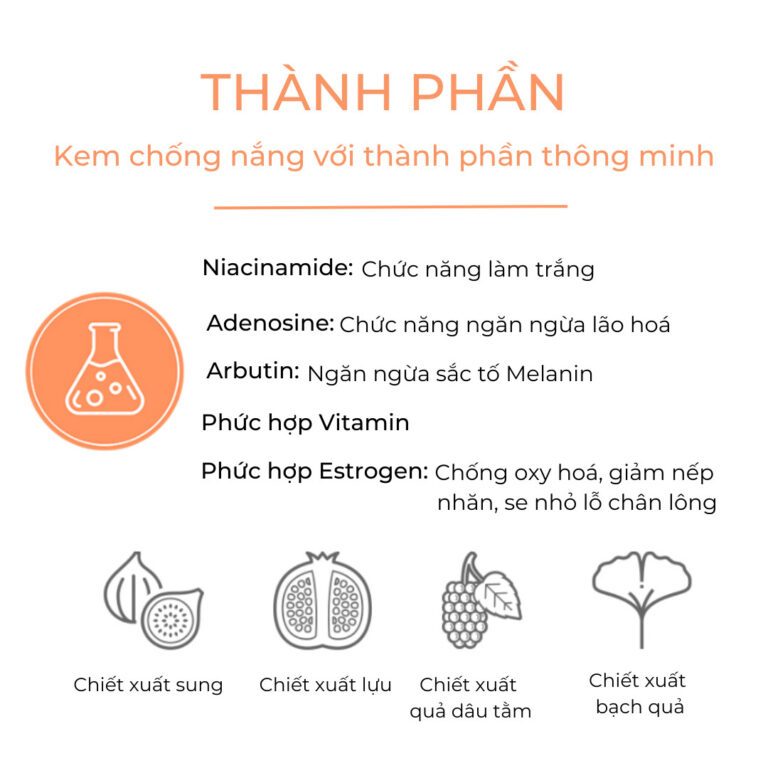 Nước tinh khiết, cyclopentasiloxane, ethylhexyl methoxycinnamate, oxit kẽm (CI 77947), cyclohexasiloxane, ethylhexyl salicylate, titan dioxide (CI 77891), polyglyceryl-3 polydimethylsiloxyethyl Dimethicone, butylene glycol, niacinamide, dipropylene glycol, ethylhexyl palmitate, polyme chéo methyl methacrylate, pentylene glycol , vinyl dimethicone/methicone silsesquioxane crosspolymer, Solbi Carbonized isostearate, dimethicone/vinyl dimethicone crosspolymer, caprylyl methicone, chiết xuất sung, chiết xuất bạch quả, chiết xuất từ quả dâu tằm, chiết xuất từ quả lựu, dimethicone, distear dimonium hectorite, polymethyl Methacrylate, polymethylsilsesquioxane, magie sulfat, C30- 45 alkylcetearyldimethicone crosspolyme, nhôm hydroxit, hydroxyacetophenone, axit stearic, adenosine, trisodium ethylenediamine disodium. Synate, isododecane, octyldodecanol, triethoxycaprylylsilane, polyglyceryl-4isostearate, isopro 77491), Titan triisostearate, arbutin, tocopherol, 1,2-hexanediol, ethylhexylglycerin, axit ascorbic, biotin, cyanocobalamin, polyaxit, axit pantothenic, pyridoxine, thiamine HCL, oxit sắt màu vàng ( CI 77492), oxit sắt đỏ