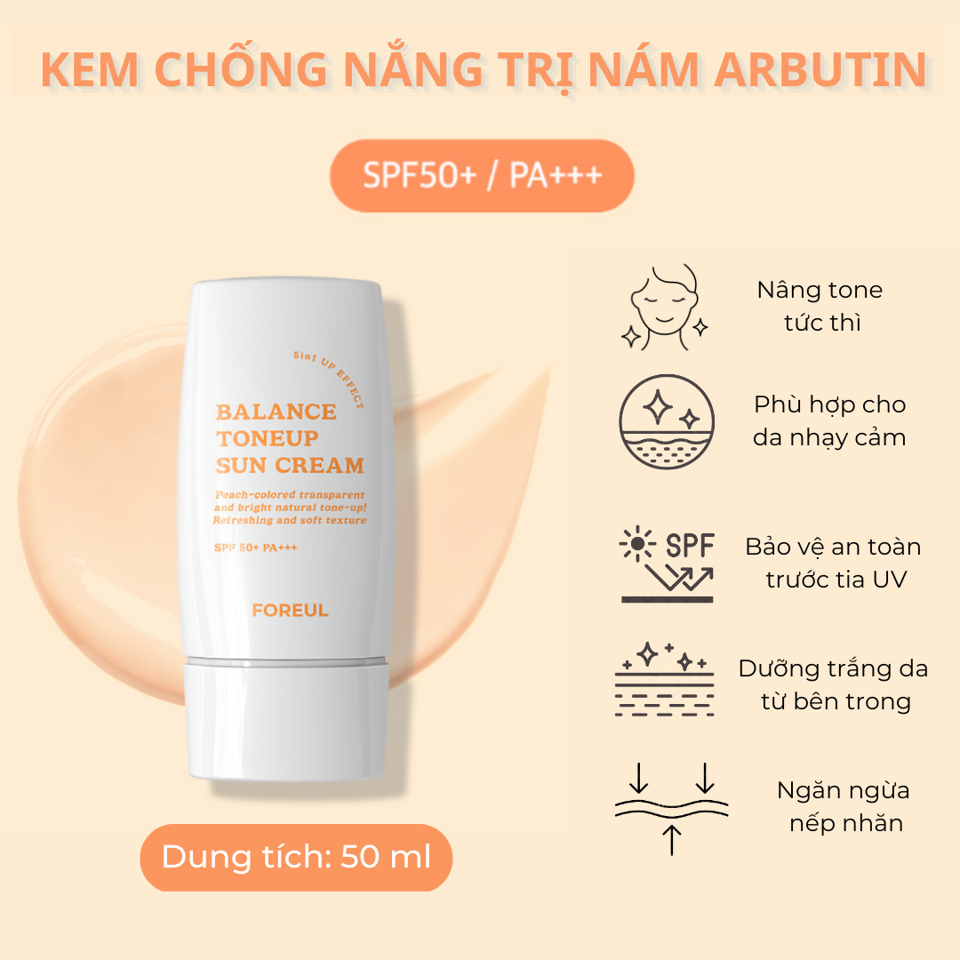 Kem chống nắng nâng tone Balance Tone Up Sun Cream Foreul với công dụng chính giúp nâng tone da nhẹ nhàng, Chống tia cực tím với Spf 50+ / PA+++, Tác dụng dưỡng trắng và làm đều màu da từ Arbutin và Adenosine, Niacinamide và Tổ hợp Vitamin C, B5, B1, B12 dưỡng ẩm, làm dịu da và cải thiện nếp nhăn trên da.